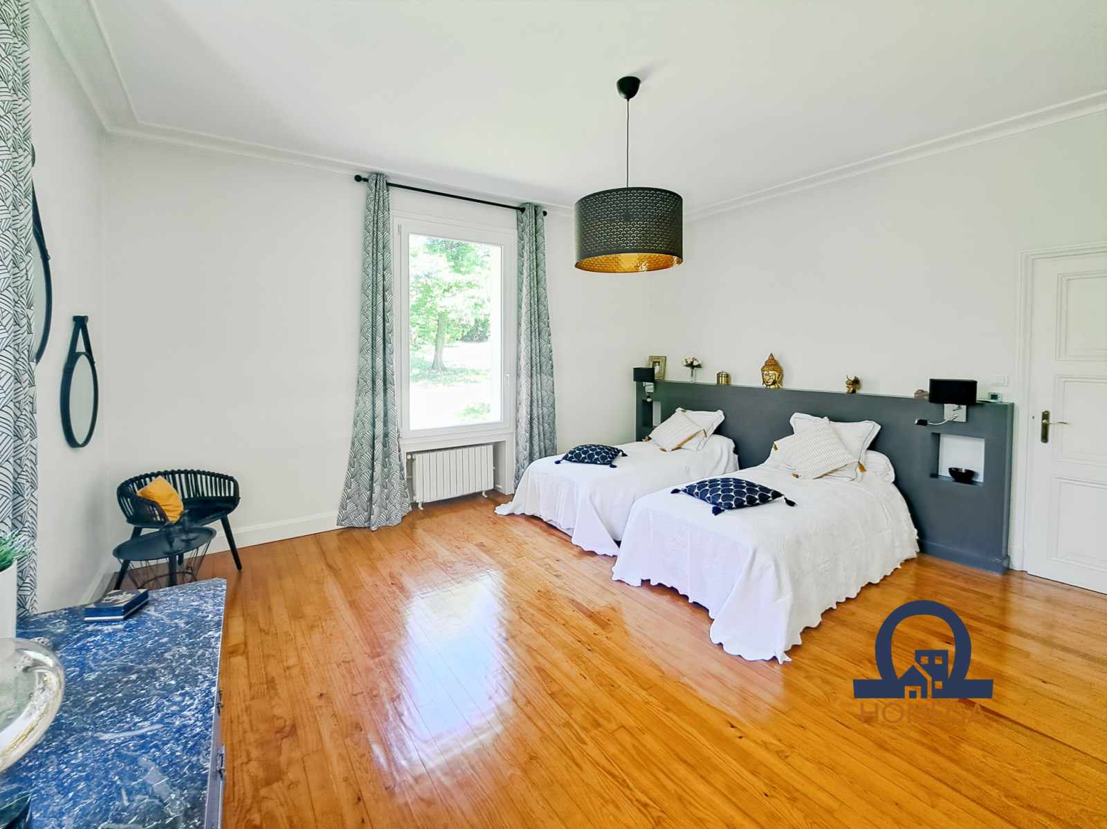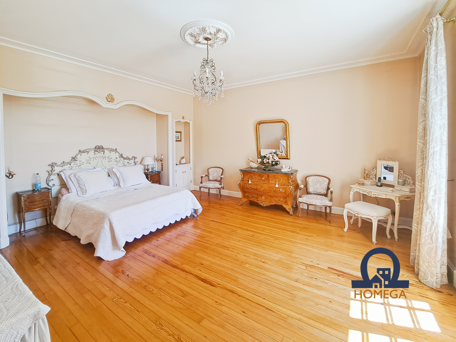 À l’étage, la partie nuit se compose de quatre appartements, chacun avec anti-chambre, grande chambre, et salle de bain ou salle d’eau. Un grand dressing indépendant, entièrement équipé, s’ajoute à l’ensemble.